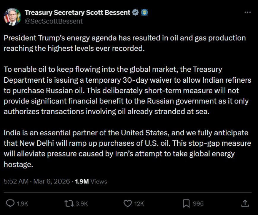 In a post on X on Friday, March 6, 2026, US Treasury Secretary Scott Bessent declared that the Treasury Department would allow Indian refiners to purchase Russian crude for a brief time.